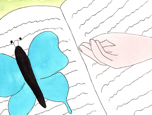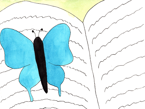 Vlinder fladderde wat rond. Hé, daar zat iemand een boek te lezen.